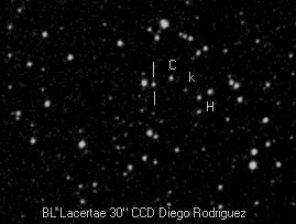 Imagen CCD de BL Lacertae.Un grupo conocido de objetos como BL Lacertae son un tipo de cuásares asociados a una galaxia con una potente radiofuente. El blazar BL Lacertae ha tenido un aumento de brillo muy significativo, incluso se podía observar con telescopios modestos. Los astrónomos profesionales realizaron un llamamiento para observar este objeto en la última semana de agosto y el blazar se comportó con una caída a la magnitud 14, para poco después recuperarse, actualmente sufre unas oscilaciones continuadas formando una curva de luz de dientes de sierra. En la figura 1 representamos la carta de este cuásar que es cortesía de Landessternwarte Heidelberg-Konigstuhl.