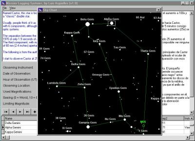 Aproximadamente dos años antes de escribir el programa, conocí a través de Internet a Steeve Waldee, un astrónomo aficionado de California. Empezamos casualmente a discutir mediante correo electrónico sobre la posibilidad de separar los componentes de $\iota$ Leonis mediante procedimientos astrofotográficos, pero empleando tan solo un objetivo fotográfico gran angular de 28mm. Aparte de lo terriblemente sabroso de nuestro intercambio de mensajes, Steeve demostró ser una de las personas más encantadoras que he conocido en Internet, de forma que solíamos intercambiar numerosos mensajes a la semana. Casualmente, Steeve había escrito un programa llamado Eyepiece que permitía calcular la visibilidad de un objeto celeste dada una combinación determinada de telescopio y ocular. En la base de datos de la versión gratuita del programa (Eyepiece-LE) estaban por supuesto, aparte de muchos objetos del catálogo NGC, todos los objetos de Messier, y cada uno de ellos tenía su correspondiente comentario. Meses mas tarde, dejé repentinamente de recibir mensajes de Steeve y comprobé con preocupación que su página web había desaparecido. Unos cuantos correos electrónicos a conocidos comunes de Estados Unidos me confirmaron que Steeve se había retirado de los círculos astronómicos debido a una penosa enfermedad. Los comentarios de los objetos de Messier incluidos en mi programa son un tributo a Steeve Waldee. De alguna forma me siento orgulloso de haberlos incluido en MLS 1.0 Pero bueno, sigamos con la descripción del programa. La apariencia del mismo se muestra en la figura 1.