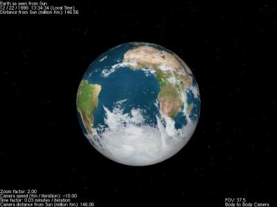 La Tierra vista desde el Sol el 22 de diciembre de 1998.He de reconocer que soy un gran apasionado de los juegos de ordenador (¿Quién no?), así que obviamente tenía que probar el Quake (supongo que sobran comentarios acerca de dicho juego) con la tarjeta aceleradora. La versión para tarjeta aceleradora hacía uso de la librería OpenGL, y además había leído en algún sitio que el programador solo había necesitado una tarde para modificar el código a fin de utilizar OpenGL. Esto era increíble, el juego tenía una calidad gráfica impresionante, iba muy rápido y además utilizaba una librería que parecía fácil de programar. A todo esto se unía el hecho de que la tarjeta aceleradora funcionaba bajo Linux (algo que no pueden decir todas las tarjetas) y era posible conseguir que la librería Mesa (compatible OpenGL y de libre distribución) hiciese uso de la aceleradora. En resumen, que casi podríamos decir que sin el GLQuake ssystem probablemente no existiría. ¿Quien dice que los juegos no sirven para nada?. También consideré en algún momento utilizar Direct3D, pero un vistazo a los ejemplos del SDK de Microsoft (bastante crípticos para los no iniciados) y sobre todo la poca portabilidad (no en vano Direct3D solo es soportado por Windows 95/98 y parcialmente por Windows NT 4.0) me hicieron inclinarme por la opción OpenGL. Y creo que la decisión fue acertada pues hasta el día de hoy ssystem ha funcionado satisfactoriamente en Windows 95/98, Windows NT, Linux, FreeBSD y varias máquinas SGI y SUN, así pues la portabilidad del código es bastante grande y casi me atrevería a decir que ssystem funcionaría en cualquier sistema que tenga un compilador de C.