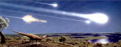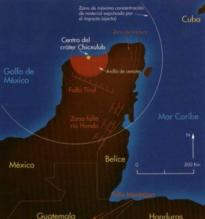 En aquella ocasión, en plena Era Terciaria, un asteroide de con diez kilómetros de diámetro y una masa de dos billones de toneladas se impacto contra el norte de la península de Yucatán y parte del litoral del Golfo de México. El centro del cráter, de mas de 180 kilómetros de diámetro se encuentra en la población de Chicxulub: "la cola del diablo" según su traducción del maya. La fuerza del impacto provocó un enorme maremoto con olas de decenas y decenas de metros de altura. Las olas del maremoto dieron la vuelta al planeta, mientras las enormes cortinas de agua penetraron cientos de kilómetros tierra adentro devastando a su paso toda la flora y fauna existente. Millones de toneladas de agua salada fueron arrojadas a la atmósfera, saturándola de vapor de agua que formó nubes lo suficientemente densas para tapar la luz del sol, convirtiendo el día en noche.