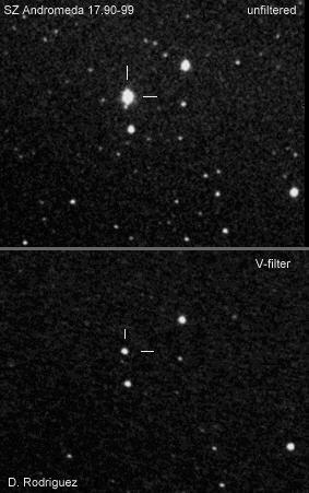 Fotometría de la estrella variable SZ Andrómeda.La estrella variable SZ Andrómeda es una estrella de espectro M2e, de tipo semirregular y es uno de los casos donde la fotometría sin filtrar tiene un error grande, del orden de dos magnitudes.