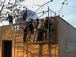 Alumnos del instituto en plena faena.La idea original nació alrededor del año 1994, y comenzó a gestarse a través de esporádicas actividades astronómicas con algunos grupos de alumnos de bachillerato. Esas actividades, su número y grado de implicación de alumnos y profesores, hizo que en los cursos siguientes tuvieran más continuidad y variedad. Tal vez uno de los momentos más culminantes de esa tarea lo constituyó la organización de las terceras jornadas culturales del instituto, que con carácter monográfico, se dedicaron, en integridad, a la Astronomía. Eso fue ya en el mes de Mayo de 1998, en donde se simultanearon las conferencias con montajes audiovisuales, Internet y, por supuesto, observaciones. D. José Luis Comellas, D. Jose Mª Quintana y D. Eduardo Battaner, fueron los conferenciantes de lujo para tres días de intensa actividad astronómica. Mi amigo Ángel Rafael López Sánchez, de la Agrupación Astronómica de Córdoba, y yo, nos encargamos del tema audiovisual e Internet, respectivamente, mientras que para las observaciones contamos con la ayuda de miembros de la Agrupación de Córdoba. Sin duda, uno de los aspectos más anecdóticos que más se recuerda de esas fechas, fue el apagón del alumbrado público para efectuar las observaciones. Para ello, contamos con la colaboración del ayuntamiento de nuestra ciudad. Con el empuje adquirido en las jornadas, nos planteamos hacer un "observatorio de verdad". El primer paso dado fue conseguir un edificio para su enclave, dentro del propio recinto del Instituto. Para eso, solicitamos al Consejo Escolar que nos cediera unas dependencias exteriores, dedicadas a almacén. Previo proyecto y aprobación, el local hubo de adecentarse y redistribuir tabiques y puertas para comenzar a darle el aspecto que deseamos. Ahí vino la segunda fase: para hacer eso, era necesaria ayuda económica. Ni el instituto ni, por supuesto, la Administración Educativa, eran sitios de donde esperásemos conseguir nada en ese sentido. Decidimos hacer un proyecto global, con presupuesto total incluido, y patearnos empresas, entidades financieras, acudir a todo tipo de convocatoria de actividades extraescolares, y toda cosa e iniciativa que pudiera surtirnos del "vil metal". D. Eduardo Battaner nos prologó el proyecto inicial.