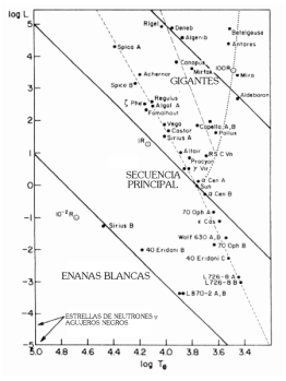 Figura 6. Diagrama Hertzsprung-Russell.El eje vertical es una medida de la energía que libera la estrella (muy relacionada con su magnitud absoluta), mientras que la abscisa nos informa del color o, equivalentemente, la temperatura de la superficie visible. Así, en el eje horizontal se puede encontrar expresado tanto en unidades de temperatura, en colores, o clase espectral. Muchas veces, sobre todo a la hora de clasificar a las estrellas, es esta última la que se toma. Están establecidas según las características de los espectros que se obtienen de las estrellas. Por motivos históricos, las clases espectrales son (de mayor a menor temperatura superficial): O, B, A, F, G, K y M. La letra M se subdivide en las letras N, R y S. Esta secuencia se puede recordar fácilmente con la frase Oh, Be A Fine Girl, Kiss Me!. El intervalo entre una clase y otra se divide en otras 10 partes. Así, el Sol es una estrella del tipo G2. Las estrellas más calientes pertenecen a la clase O5, con temperaturas superficiales de 40 000 K, y las más frías a la clase M8, con unos 2400 K. Las principales características (líneas de absorción) que definen los espectros de cada una de las clases son: