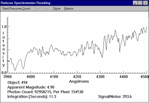 En la columna de la derecha, aparecen las opciones del instrumento, en este caso el espectrógrafo. Como se necesita una pantalla especial para el análisis, sólo aparecerá el botón Take Reading que pulsaremos para tomar el espectro de la estrella, una vez centrada.