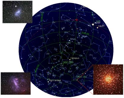 Con telescopios pequeños, medianos o grandes, todo irá bien. Para objetos como los Messier, lo recomendable es usar oculares de poco aumento y gran campo. ¿Qué podemos observar? Por estos meses, tenemos una buena variedad de objetos Messier a la vista. Entre los más conocidos: Las Pléyades (M45); la Gran Nebulosa de Orión (M42) conjuntamente con su satélite M43; el Pesebre (M44) en Cáncer; variedad de galaxias en Virgo y Coma Berenice, etc. Observando hacia el Sur, las fascinantes Nubes de Magallanes nos ofrecen sus maravillas. Comencemos por la Gran Nube de Magallanes, esta galaxia irregular con aspecto verdaderamente de nube a simple vista. Debemos ser realistas: la contaminación atmosférica de las grandes ciudades nos obliga a retirarnos hacia las afueras para poder apreciarlas en toda su magnitud, tanto a la mayor como a la menor. Encontramos la Gran Nube en la constelación del Dorado. Cubre unos 12° del cielo. Se encuentra a una distancia de 160.000 años luz y tiene una magnitud de 0,9. En esta galaxia se encuentra una nebulosa gaseosa gigante llamada 30 Doradus, más conocida como Tarántula. Multitud de cúmulos y nebulosas se apiñan en esta galaxia. Las observaciones más hermosas de La Gran Nube, así como de la pequeña, tuve oportunidad de hacerla desde locaciones alejadas de los centros urbanos, aprovechando los largos viajes a Mendoza o a la Patagonia. En esos cielos claros y limpios, lejos de cualquier tipo de contaminación, se admiran al punto de la emoción a simple vista. Se puede ver de un color perlado brillante. Con binoculares, son extraordinarias. Dejo el lujo de los mil detalles para quien se vea tentado a observarla detenidamente. La Pequeña Nube de Magallanes es otra galaxia irregular. Se encuentra en la constelación de Tucán, cubre un área de unos 8°, y presenta una magnitud de 2,3. Se encuentra a una distancia de 190.000 años luz. Esta pequeña galaxia es una de las más cercanas a la nuestra junto a la Gran Nube de Magallanes. Tiene pocas nebulosas y menos polvo que la Gran Nube, aunque tiene una mayor proporción de estrellas. Estos dos objetos son imperdibles, y están a disposición del ojo del observador gran parte del año. Muy cerca de la Pequeña Nube de Magallanes, encontramos otro objeto imperdible, el cúmulo globular 47 Tucanae (NGC104), que se encuentra en la constelación de Tucán. Tiene una magnitud de 4,0 y es uno de los cúmulos globulares más próximos: su distancia es de unos 20.000 años luz. Es de una belleza muy particular. Su alta concentración de estrellas nos deja fascinados. En belleza, a mi ver, en esta zona del cielo es sólo superado por Omega Centauri. Se encuentra en AR 00 h 24,1 m dec: -72° 05'. En esta misma zona, muy cerca de 47 Tucanae y de la Pequeña Nube de Magallanes (sobre ésta y a la izquierda de 47 Tuc) tenemos otro cúmulo globular. NGC 362 tiene una magnitud de 6,6. Es también un cúmulo muy compacto, aunque no como 47 Tuc, no tan fácil de ver y, por supuesto, no tan atractivo como aquél. Su ubicación: AR 1 h 03 m 12,0 s dec -70° 51'. Se encuentra a una distancia de 8,7 kiloparsecs. Si esperamos hasta la medianoche, al levantar más la Vía Láctea en esta zona -observando hacia el horizonte sur- veremos muchos objetos destacados. Entre ellos uno de los más atractivos es NGC 2516. Este cúmulo tiene un gran tamaño. Se observa en detalle con telescopios de campo amplio. Tiene una magnitud de 3,8 y se encuentra a una distancia de 440 parsecs en la constelación de Carina. Está compuesto por estrellas que van de la magnitud 7 a 13, y tiene una antigüedad de 100.000.000 de años. Su tamaño aproximado es de 1° (para comparar, la Luna tiene medio grado). En esta zona que menciono, busquen después de medianoche, y a quien guste jugar disfrutando de la observación, que haga un barrido de la zona. Se encontrarán con objetos deliciosos y sorprendentes.