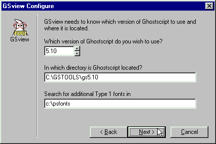 Instalando GhostScript & GSview en MS-WindowsLa instalación de GS y GV en Windows95/98 es realmente simple. Únicamente ha de copiar el archivo GS.ZIP que ocupa poco menos de 3 MB a la unidad C: de su disco duro y descomprimir su contenido con el WinZip o programas similares en la carpeta C:\GSTOOLS. Con el Explorador de Windows ejecute el programa gsview.exe de la carpeta C:\GSTOOLS\GSVIEW y ya tendrá casi listo su programa visor de PostScript.Para instalar estos programas en otro destino diferente, simplemente